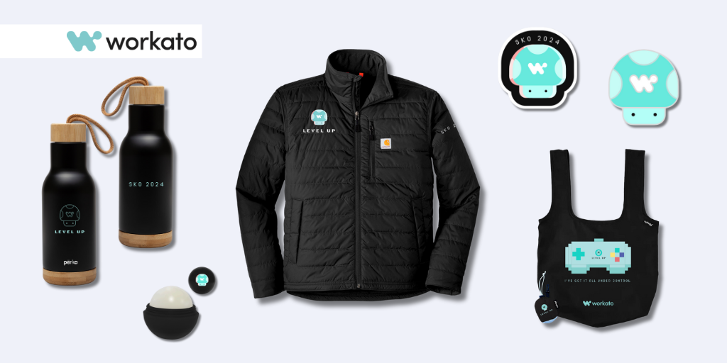 Workato curated a great assortment of apparel, drinkware, and accessories for their team to enjoy at their “Level Up” SKO in 2024. The Carhartt Gilliam Jacket is a stylish classic and the Perka Altair Stainless Steel Water Bottle is an excellent sustainable, high utility item. Additionally, they gifted a lip balm, enamel pin, and sticker along with a Bagito Original Reusable Shopping Bag to help carry the items. All the swag items featured cohesive gamer style designs to tie in the theme and create a memorable event.