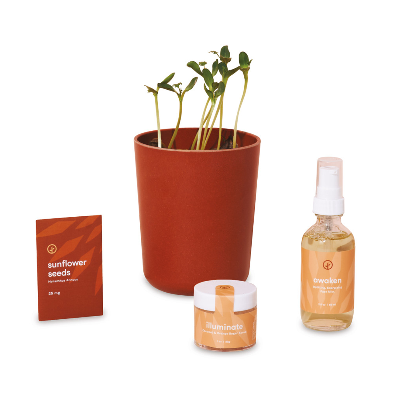 - Includes sunflower grow kit, non-GMO sunflower seeds, energizing facial mist, and a brightening sugar scrub